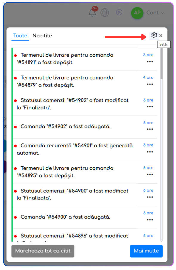 Pentru o navigare mai intuitivă și un acces rapid la informațiile importante, meniul de notificări a fost mutat. Toate funcțiile extinse (vizualizare completă, configurare, marcarea notificărilor) au fost centralizate direct sub pictograma 🔔 Clopoțel din bara principală, eliminând necesitatea unei secțiuni separate în meniu.