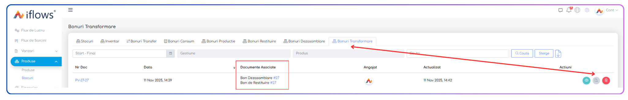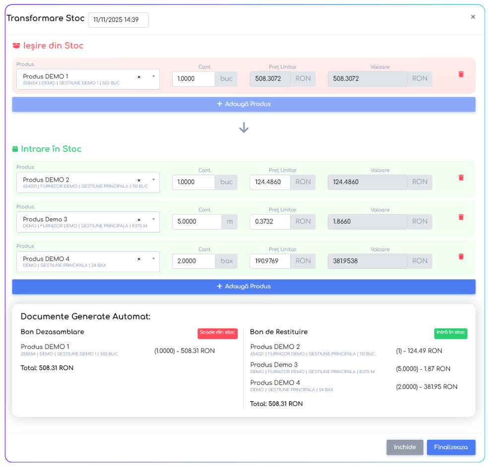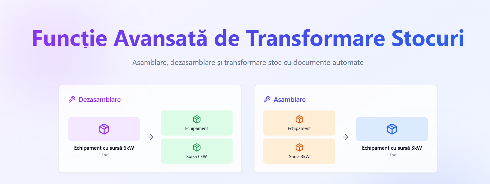 Funcția Transformare Stoc a fost reproiectată integral pentru a acoperi scenarii complexe de gestiune, unde produsele existente în stoc sunt convertite, combinate sau dezasamblate în alte produse.