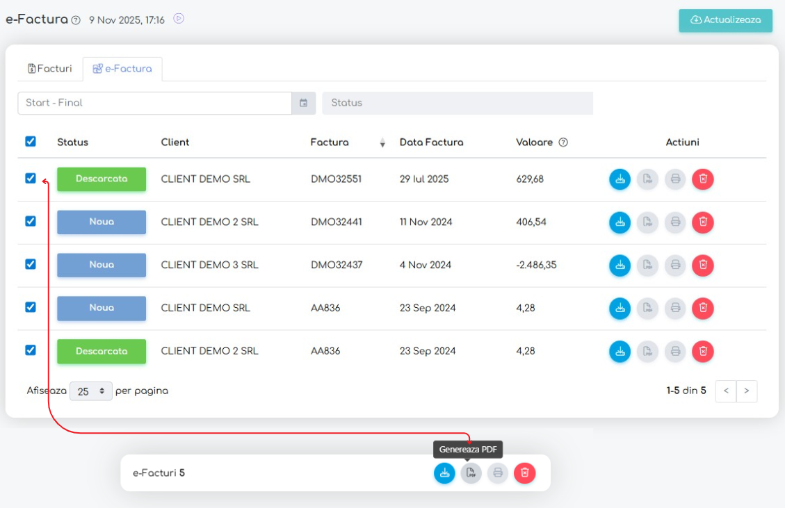 | Generare PDF | Creează instant fișiere PDF pentru toate facturile bifate. | PDF-urile sunt descărcate local într-un fișier arhivat (ZIP). |