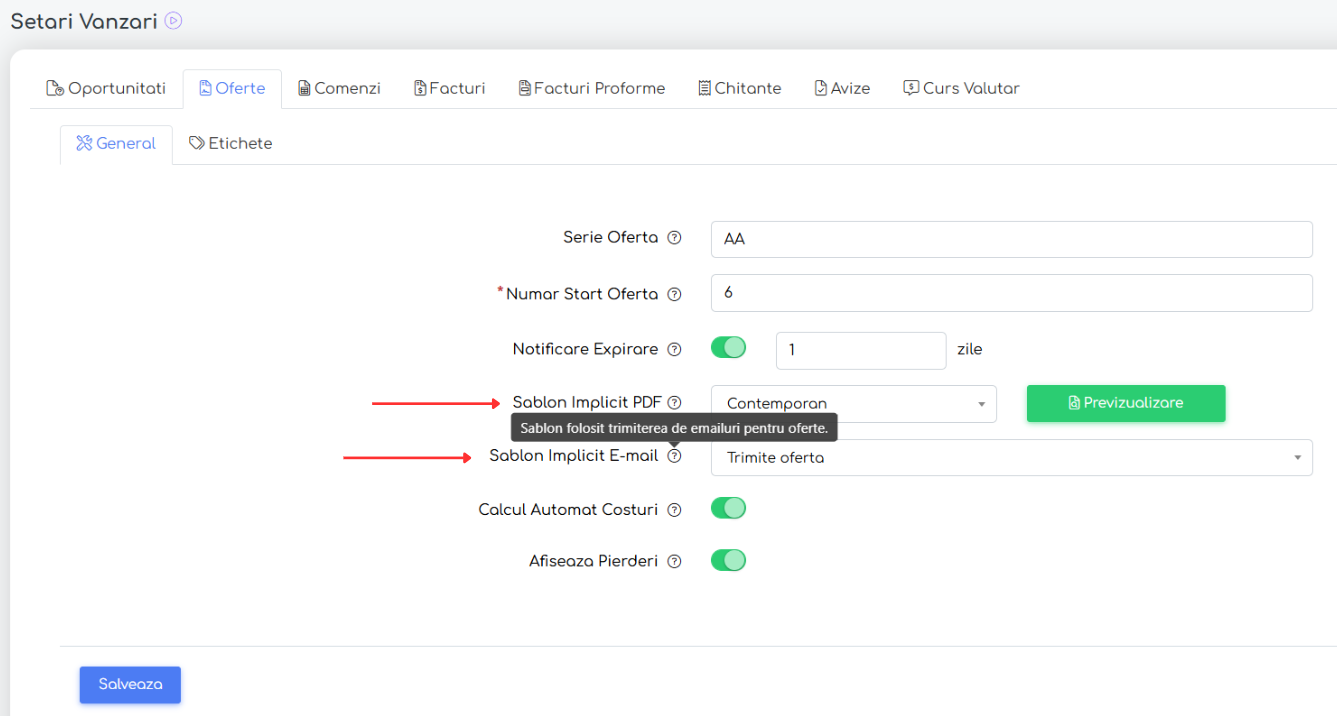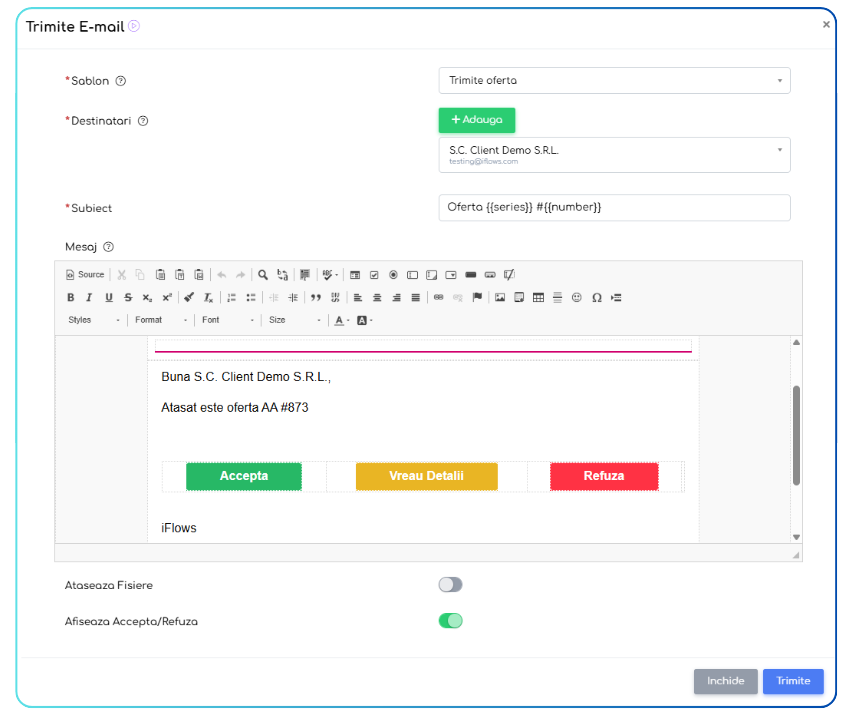 Funcția este disponibilă la nivel de șablon: Setări → Șabloane → E-mail