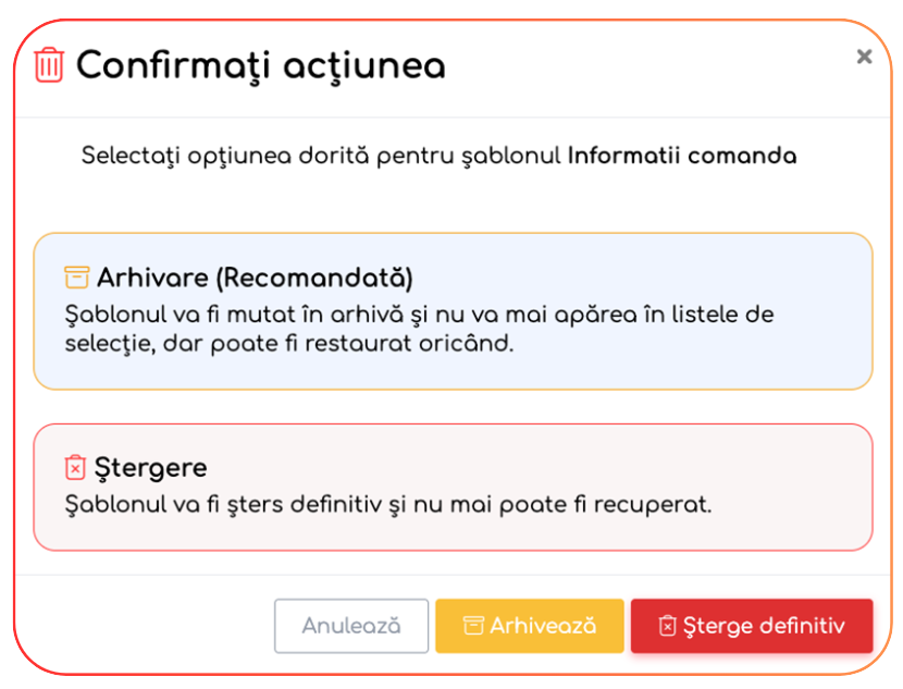 - Șablonul va fi mutat automat în noul tab „Arhivate” și nu va mai apărea în listele de selecție la trimiterea e-mailurilor.