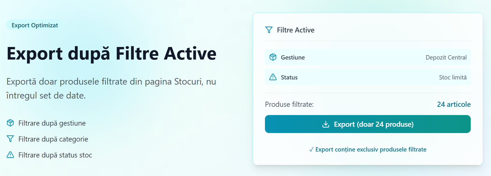 Funcționalitatea de export din pagina Produse → Stocuri a fost optimizată pentru a reflecta cu exactitate filtrele active la momentul generării fișierului.