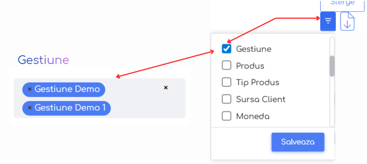 Acesta permite utilizatorilor să limiteze rapid rezultatele afișate în funcție de gestiunea din care provin datele (ex: în secțiunea Vânzări, Comenzi, Produse, Facturi etc.).