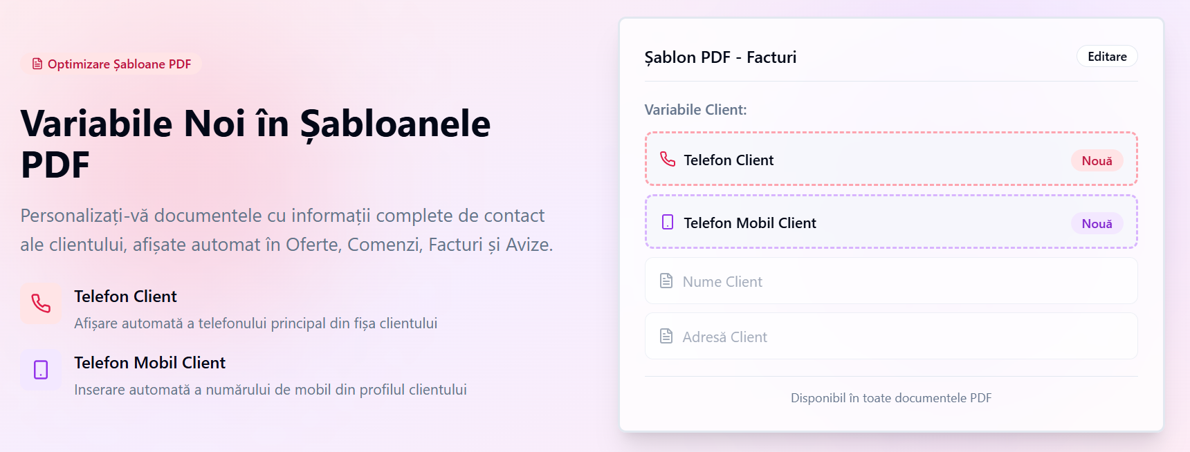 Acestea pot fi utilizate în toate tipurile de documente PDF (Oferte, Comenzi, Facturi, Avize, Proforme etc.) și permit afișarea automată a numerelor de telefon ale clientului, direct în șablonul utilizat.