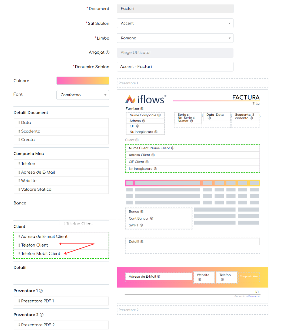 Pentru a extinde posibilitățile de personalizare ale documentelor generate în iFlows, au fost introduse două variabile noi dedicate datelor de contact ale clientului.