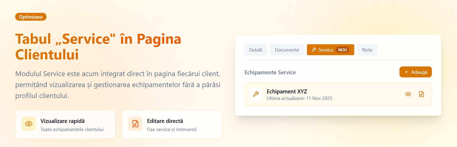 Această integrare permite vizualizarea și gestionarea echipamentelor asociate unui client fără a mai fi necesară navigarea în modulul principal de Service, oferind o experiență unitară și completă la nivelul profilului clientului.