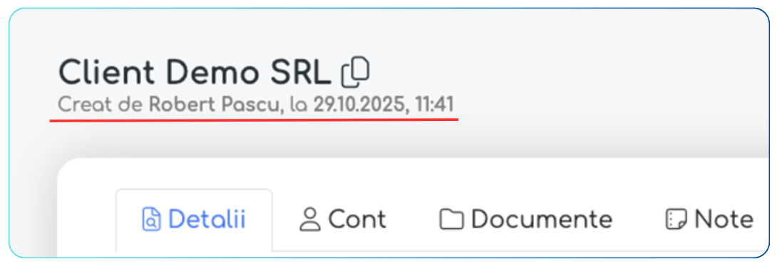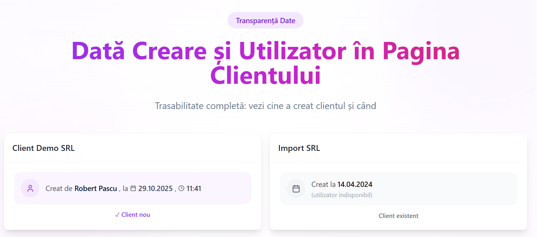 Se afișează numele complet al utilizatorului și data + ora exactă la care clientul a fost creat. - Pentru clienții existenți (anterior implementării):