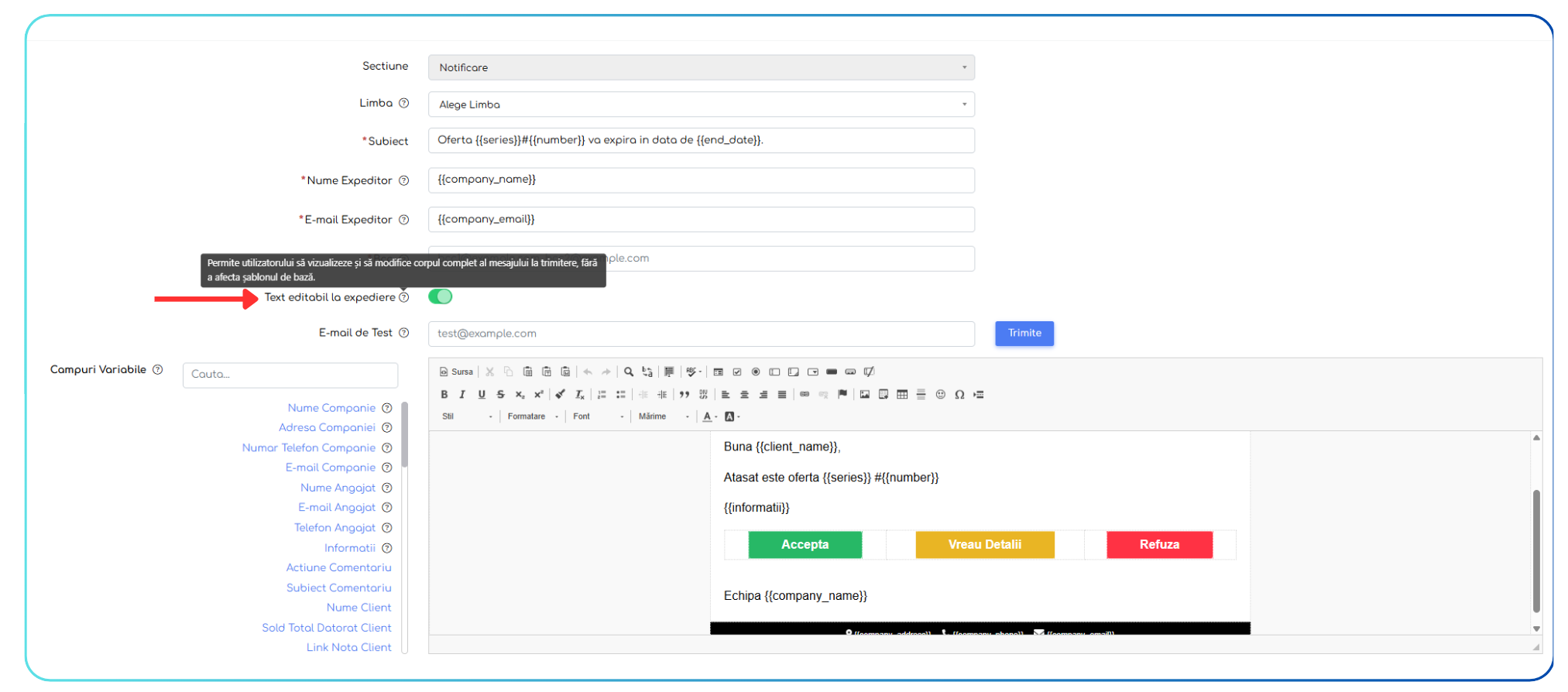 Prin noua opțiune „Text editabil la expediere”, utilizatorii pot adapta conținutul înainte de trimitere, fără a modifica șablonul de bază din sistem.
